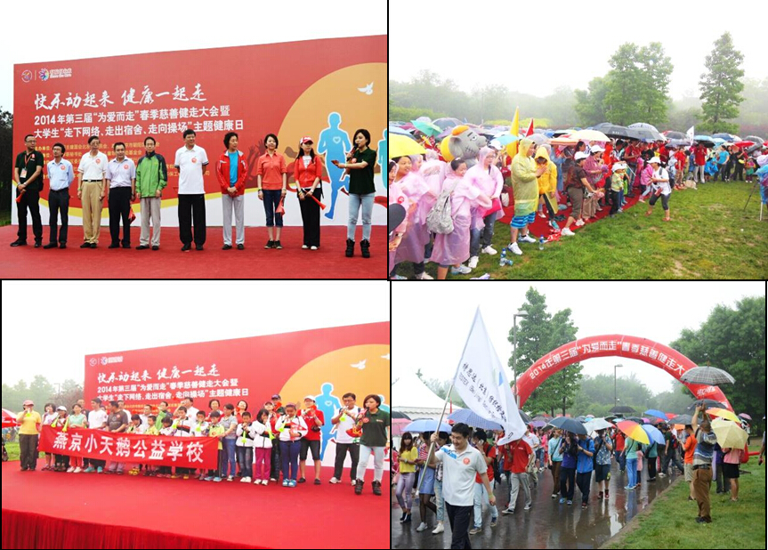 ,雨中的北京奥林匹克森林公园充满了快乐的气氛,来自华亿在线中国有限公司、可口可乐、康菲石油等50余家知名企业和20所高校的5000多名志愿者在北京奥林匹克森林公园,共同冒雨参加了2014年第三届“为爱而走”春季慈善健走大会暨大学生“走下网络、走出宿舍、走向操场”主题健康日活动。活动旨在以行走的方式,传播和推广健康生活理念,为改善打工子弟学校学生的学习和生活条件募集善款。