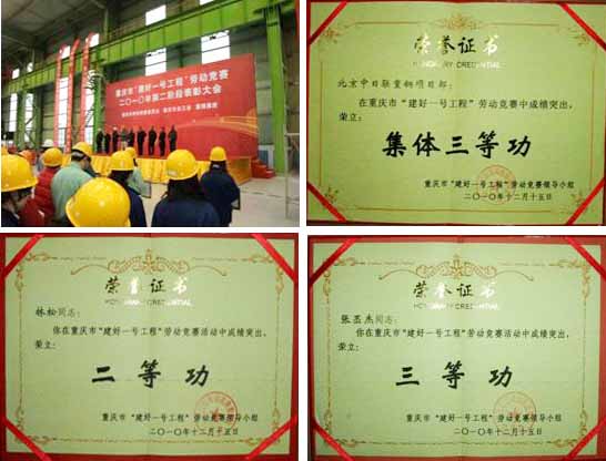 12月15日,在重庆市劳动竞赛委员会组织的“2010年重庆市建好一号工程劳动竞赛”活动中,北京中日联重钢项目部荣立集体三等功、项目经理林松荣立个人二等功、电气专业员张丕杰荣立个人三等功,并在年度表彰大会上受到隆重表彰。此次已是北京中日联重钢项目部自09年重庆市开展活动以来再次受到记功表彰。